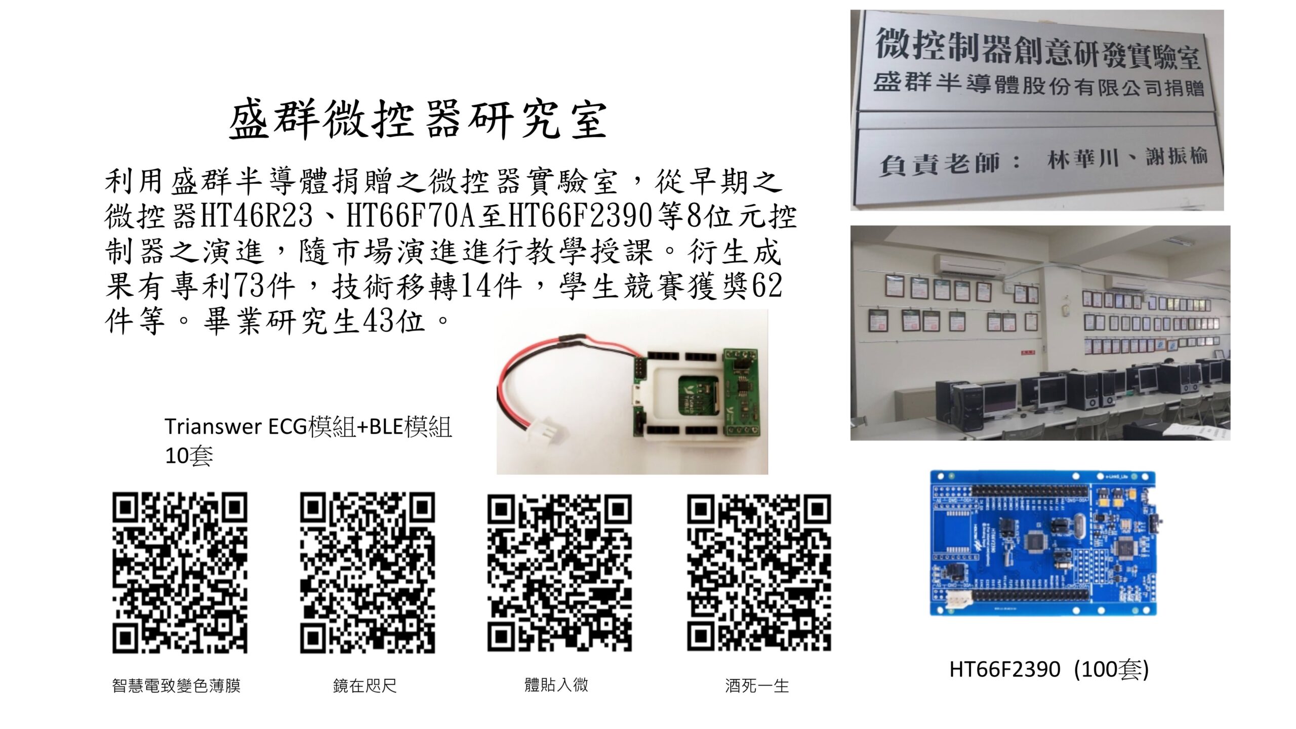 微控制器創意研發實驗室 領域: 光資訊、光通訊與光電精密量測 實驗室名稱: 微控制器創意研發實驗室 位置: 綜一館一樓BGA0142 參與教授: 謝振榆 教授 研究方向: 微控制器應用設計 附檔: 實驗室簡介