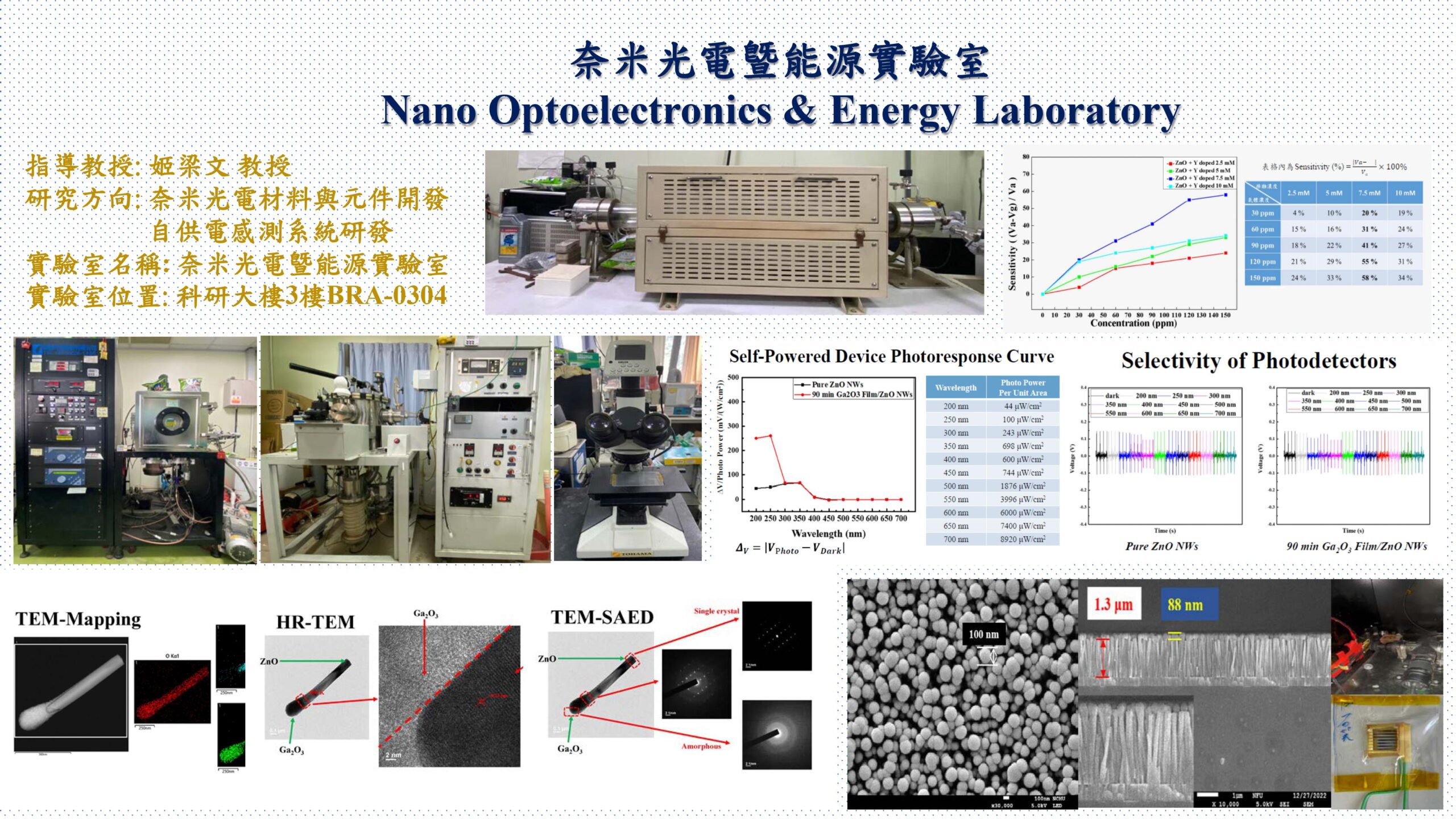 奈米光電曁能源實驗室 領域: 光電元件與材料 實驗室名稱: 奈米光電曁能源實驗室 位置: 科研大樓3樓BRA-0304 參與教授: 姬梁文 教授 研究方向: 奈米光電材料與元件開發、自供電感測系統研發 附檔: 實驗室簡介